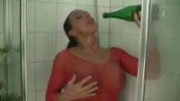 Симпатичная девушка сидя на унитазе показала запечатанную бутылку, после чего отошла с ней в душевую кабинку, где открыла, облизнув чтобы легче вошло. Началась дрочка шампанским. Оно от тряски мощно вырывается наружу, сочной струей выбиваясь через свободное место из влагалища. Приятное пощипывание, необычная обстановка и ощущения подарили всего за время меньше минуты пару оргазмов перевозбужденной немке. Ну как не попробовать хороший напиток, не облив его на крупные сиськи под прозрачной одеждой?!