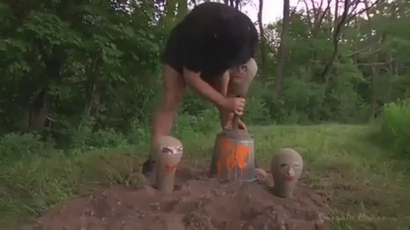 Мужчина придумал довольно извращенную игру. Он закопал симпатягу в землю по самое горло. А потом накрыл голову ведром, выставил еще две мишени и начал стрелять по ним краской. А потом убрал ведро и начал насиловать беспомощную жертву в рот, глубоко засовывая член в глотку. Отымев хорошенькую милашку, мужик кончил ей в ротик, а потом выкопал и связанную увез из леса.