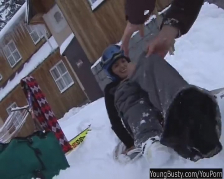 Спортсмен-извращенец прямо на улице зимой стал домогаться свою подопечную - будущую чемпионку по горнолыжному спорту. Сняв основную куртку и задрав кофту, он увидел шикарные сиськи девушки, которые дали приток большому количеству крови в пенис его владельца и холодная зима ничуть не уменьшила его в размерах. Приспустив с себя штаны, тренер дал в рот красавице, а после трахнул в разных позах. Паре повезло, что никто не увидел секс горнолыжников из отдыхающих, ведь они совершили половой акт рядом с домиками, могли бы и "влететь".